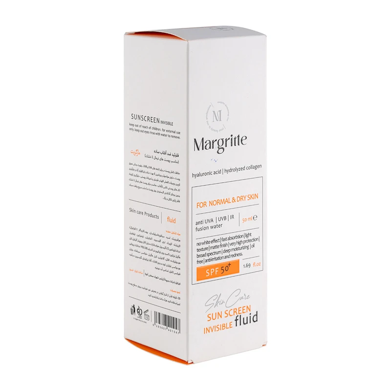 فلوئید ضد آفتاب بدون رنگ مارگریت SPF 50 مدل fusion Water محافظ UVA و UVB، ضد لک و روشن کننده، مناسب برای پوست های خشک و نرمال حجم 50 میلی لیتر